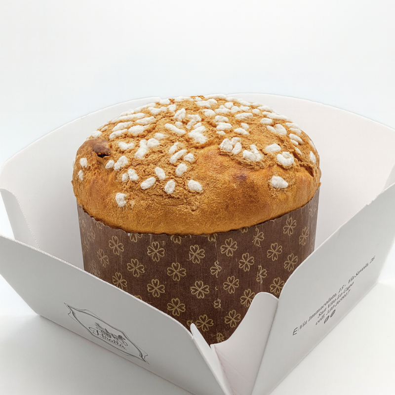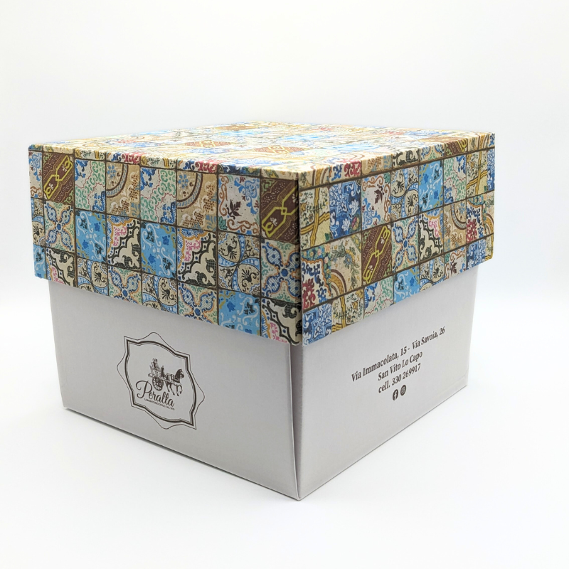 La scatola Elegant è realizzata in cartone microonda KKK vegetale, un materiale resistente e idoneo al contatto alimentare. Questo modello esclusivo si distingue per la sua praticità: una volta rimosso il coperchio, la base si apre trasformandosi in un piatto funzionale, ideale per servire o tagliare il panettone direttamente all’interno della confezione.